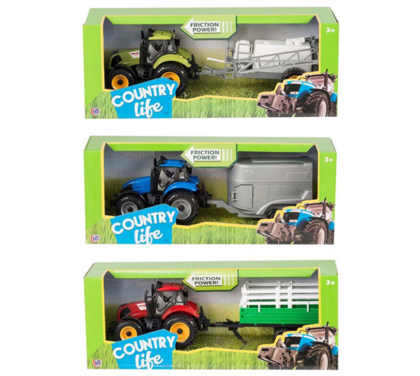 Country Life Tractor & Trailer Set Friction Power Size: 32x10x12cmSuitable for 3 years plusChoice of colour tractor; Blue. Green, Red(Please select colour choice - 1 supplied)