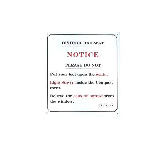 District Railway Notice - Feet on the Seats sign