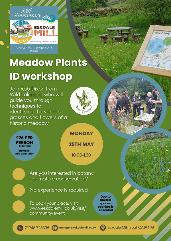 Meadow Plant Identification Workshop start:10:00 ** NOT LIVE ** Discover the hidden richness of meadow life in this hands-on plant identification workshop led by Rob Dixon of Wild Lakeland.Set within a beautiful historic meadow, this relaxed and informative session will introduce you to practical techniques for identifying a wide variety of grasses and wildflowers. Whether you’re completely new to botany or looking to build your confidence in the field, Rob will guide you through key features, observation skills, and simple methods you can use again and again.This is a wonderful opportunity to slow down, look closely at the natural world, and deepen your understanding of the plants that shape our landscapes. No prior experience is needed—just curiosity and a willingness to explore.Spaces are limited to ensure a friendly, small-group experience, so advance booking is essential.Your ticket also includes admission to the mill. May 25 2026 start:10:00